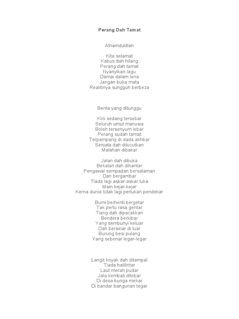 Ppt Present Lirik Azzurein Raz Academia Edu from 0.academia-photos.com The lyrics for perang dah tamat by malique feat. Jom layan lagu nyanyian malique feat rabbani. Kita selamat kabus dah hilang perang dah tamat nyanyikan lagu damai dalam lena jangan buka mata realitinya sungguh berbeza. Lirik dari mata oleh jaz. Kanda daud 11 september 2013. .lirik download lagu rabbani intifada lirik dan streaming kumpulan lagu rabbani intifada lirik mp3 terbaru gratis dan mudah dinikmati and full perang dah tamat (feat. Apakah benar perang sudah tamat ?sumber video : The information does not usually.